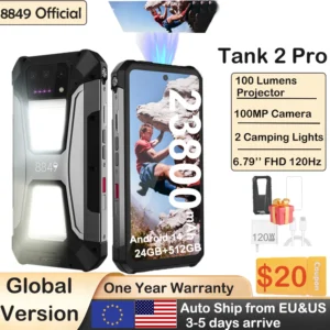 3.5mm Headphone Port: Yes Android: Android 14 smartphone Battery: 23800mAh Battery Capacity Range: 7500+ mAh Battery Capacity(mAh): Other Battery Type: Not Detachable Biometrics Technology: Fingerprint Recognition,Face Recognition Bluetooth Version: YES Brand Name: 8849 Built in radiator: Yes Built-in GPS: Yes CPU Model: MTK Cellular: 3G,2 G,4G Charging Interface Type: Type-C Charging Power: 120W Design: Flip,Bar Display Resolution: 2460x1080 Display Size: 6.79" Fast Charging: Supercharge Front Camera Pixel: 32MP Front Camera Quantity: 1 IP68/IP69K: Yes Language: Arabic,Polish,German,Russian,French,Korean,Norwegian,Portuguese,Japanese,Turkish,Spanish,Italian,English,English,Russian,German,French,Spanish,Polish,Portuguese,Italian,Turkish,Norwegian,Korean,Japanese,Arabic Model: Helio G99 Memory Card Type: Dedicated slot NFC: Yes Name: Unihertz 8849 Tank 2 Pro Operation System: Android Other Features: Photograph Phone,Fast Charging Phone,Sports Phone Rear Camera Pixel: 100MP Rear Camera Quantity: 3 SIM Card Quantity: 2 SIM Card Screen Material: LCD Screen Refresh Rate: 120 Hz Screen Type: Normal Screen Touch Screen: Yes,Yes Wi-Fi Transmission Standard: 802.11ax,802.11ac,802.11n 2.4GHz/5 GHz,802.11b/g,802.11a Wi-fi: Yes Wireless Charging: No